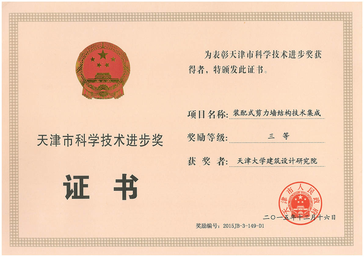 • 裝配式剪力墻結構技術集成(天津市科學技術進步獎三等獎)