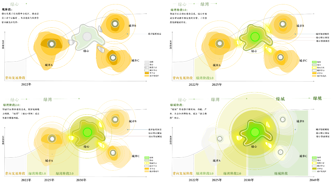 方案借鑒國內外營城理論,創造性提出“生態綠灣”的長株潭都市圈空間發展范式,并提出從綠心到綠境,四大階段成長路徑。將綠心從被動接受三市中心輻射的生態隔離帶,成為帶動都市圈空間、功能、產業、生態和治理重構的生態綠灣,建構城市融于綠境的都市圈“綠心+”崛起路徑,創建生態優先、道法自然的新時代中國營城范例。