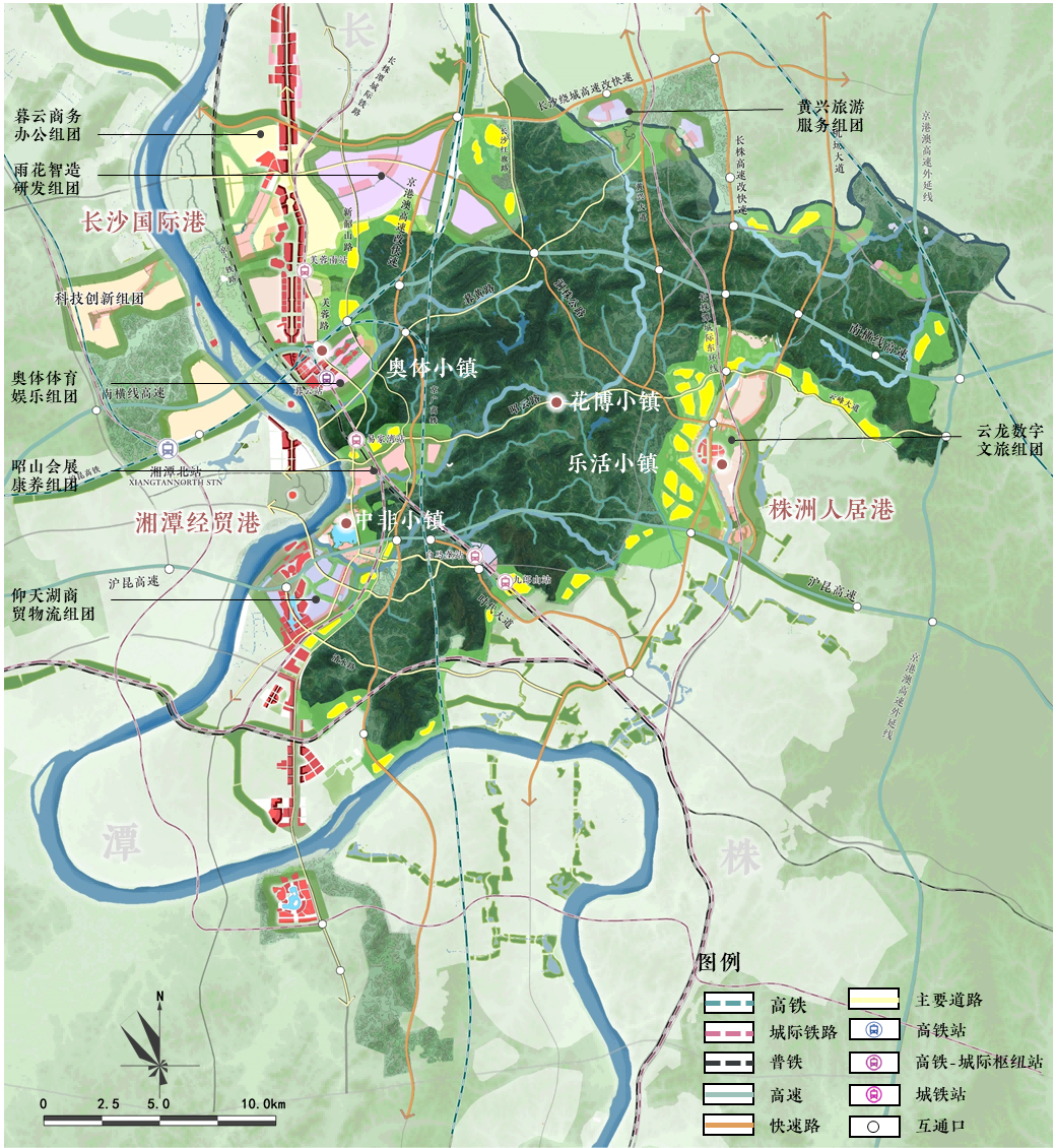 方案提出“大國苑囿,生態綠灣”的概念,對標中國傳統苑囿概念,賦予綠心在特色外交、科技創新、生態保育、文化展示方面重要職能;立足推動長株潭一體化進程,創新提出生態文明時代的都市圈發展范式,生態綠灣,為長株潭一體化發展路徑提供學理支撐。