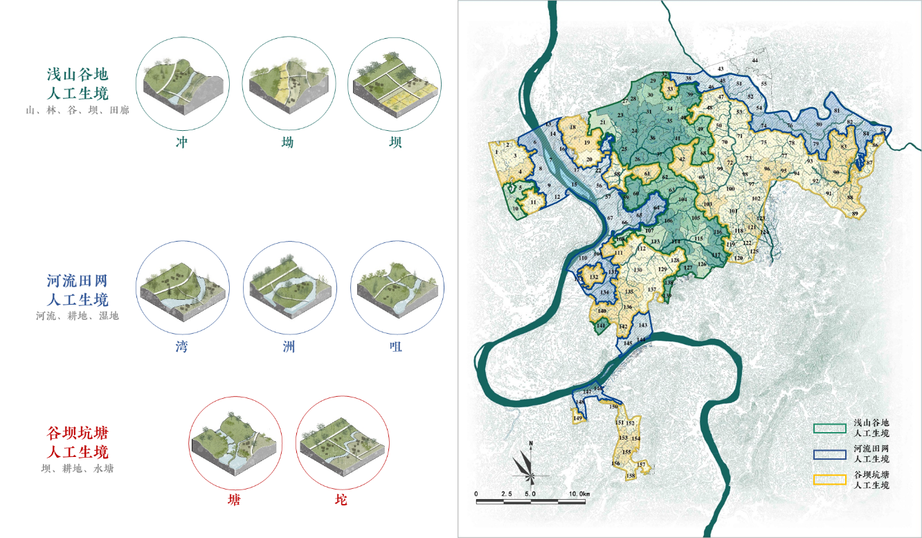 鄉村聚落藤蔓體系是基于長株潭綠心鄉村聚落特征總結歸納而成,體現湖湘農耕文化和在綠心地區傳承上千年的人居空間邏輯。首先按照“順應自然、適應自然、微改造自然”的原則,梳理出依托自然生長的三級藤蔓體系;結合既有行政村邊界,將上千個自然村落劃定為具有明確身份標識的158個藤蔓單元,歸納為沖、坳、壩、灣、洲、咀、塘、坨,共計三類八種綠心人工生境。