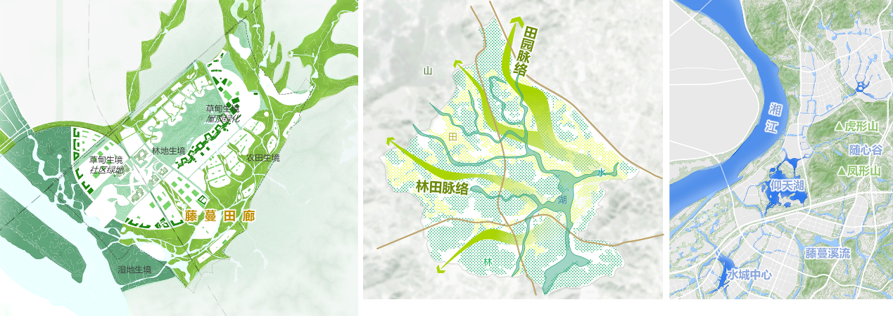 遵照鄉村聚落藤蔓體系的識別結果,延展藤蔓結構限定空間形態:在奧體小鎮借助藤蔓田廊,串聯“山丘林田草”多彩地景,為小鎮提供山頂密林、田野麥浪、運動草坪;在花博園依山就勢,統籌“山水林田湖”多元自然要素,構建指狀延伸的自然生態格局;在中非小鎮演變為水綠藤蔓,“江洲湖島溪”多樣水表情,演繹浪漫山水江之居。