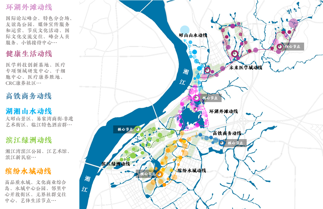 以湘江、瀏陽河為載體,與綠心內的山水脈絡及鄉村藤蔓體系串聯,聯通藝術、文旅職能和浪漫生態人居體驗,構建湖湘韻味的美好生活場景,成為自然靈動的山水樂軸。