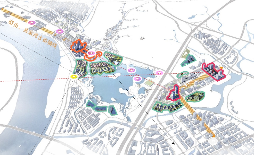 著眼于南起衡山,北至洞庭,東至幕連九山脈,西至韶山山脈的長株潭三市山水場域,總結出“衡山湘水入洞庭,山水洲城望湘心”的場域特征。從古詩詞、三市舊址選位、長沙星宿對位、如今三市重要空間序列,提出北起長沙天心閣、南至湘潭金霞山的湖湘中軸,并在中軸之上謀劃外交、科研、TOD樞紐等系列重大項目,使之成為傳承歷史面向未來、統領長株潭三市的營城禮軸。