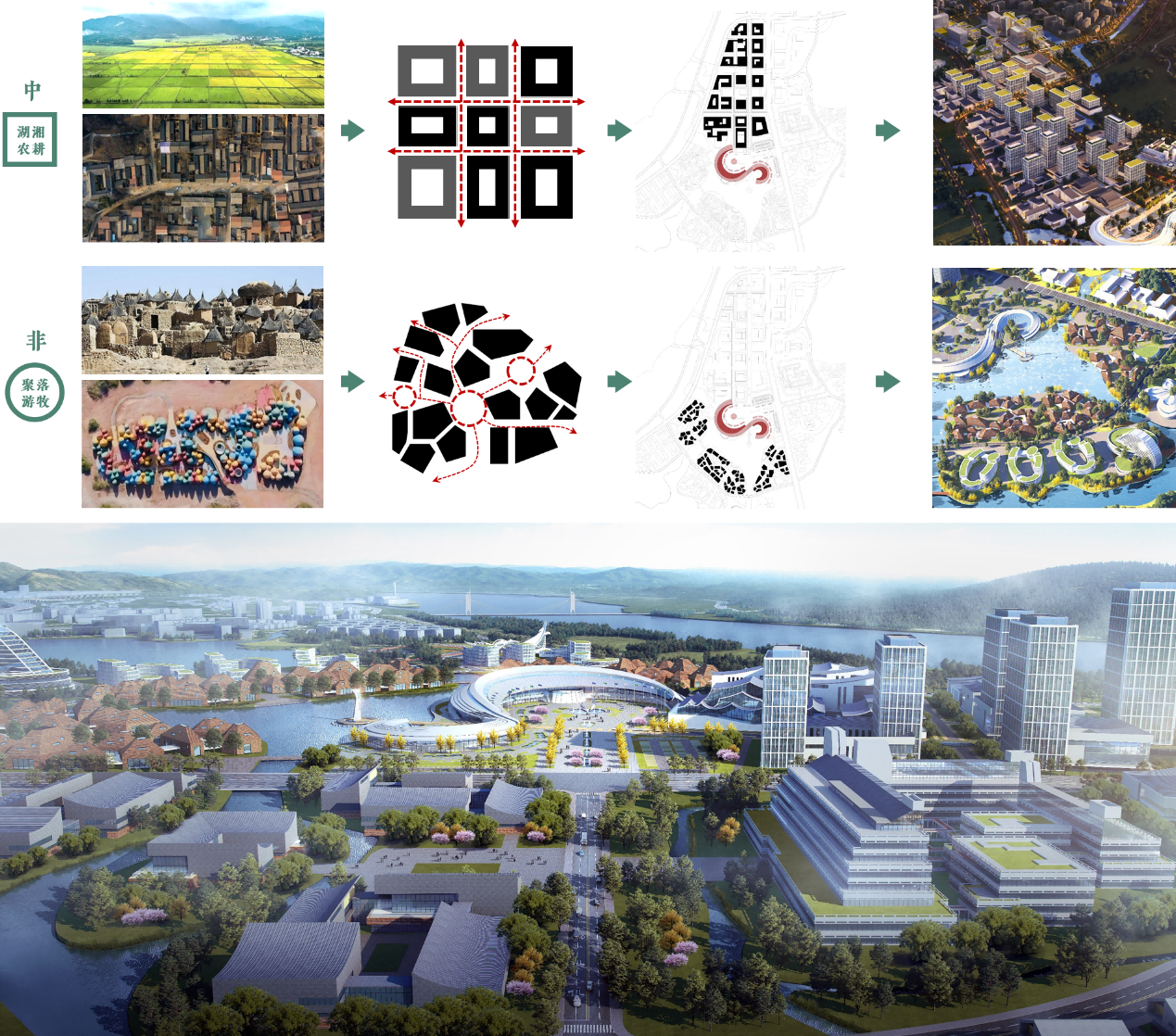 在外灘中非峰會區域,北部片區提取湖湘農耕稻田文明,采用井田式院落布局,院落四方圍合,內聚外放,形成業態復合、禮序井然的中式綜合街區;而南部則是提取非洲草原部落文明,采用中心內聚式建筑簇群布置方式,形成極具鄉土氣息的非洲特色主題街區。