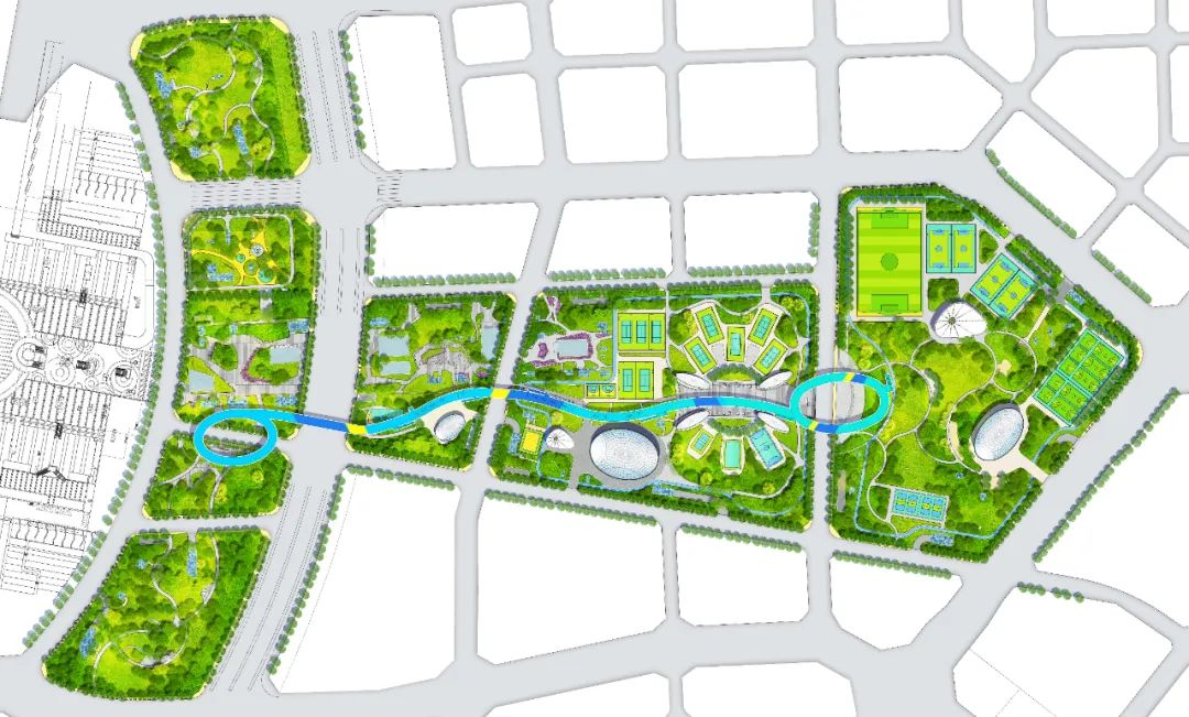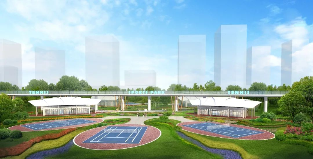 四個分區各有特色,又相輔相成,互為補充。在地鐵上蓋建設城市體育公園,以體育鍛煉為主題,將體育鍛煉與自然景觀相融合,兼有全民健身和體育專業比賽的功能。其中運動場地包含足球場、籃球場、網球場、排球場、羽毛球場、乒乓球場和門球場,共計111處。建筑物及構筑物包含多功能運動廳、室內網球館、健身館、乒乓球競技館、管理用房、風雨籃球場、如意彩虹空中走廊及相應配套設施等。