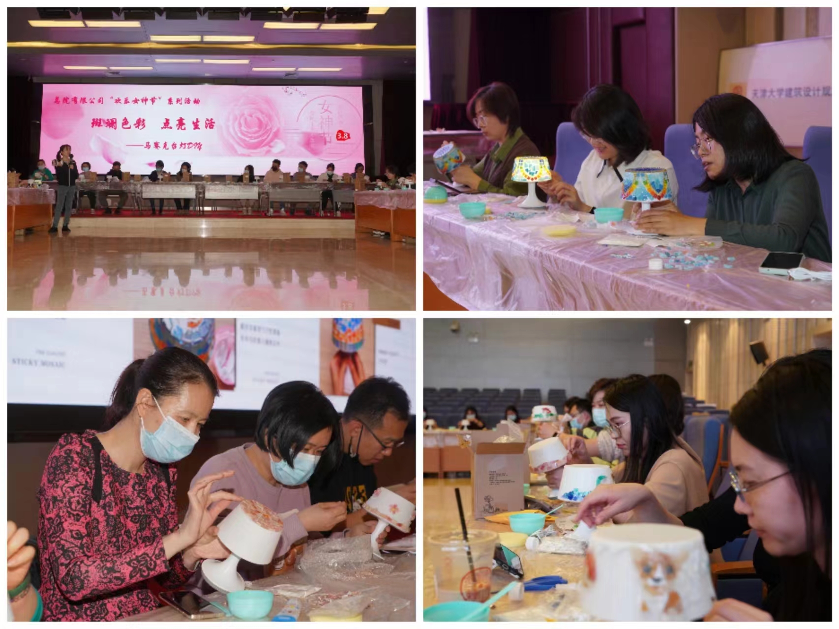 馬賽克臺燈制作作為總院有限公司“歡樂女神節”系列的開局,于3月7日在十層報告廳如期舉辦,共有50位員工參加。在工會副主席儲乃東做完開場講話后,楊莉介紹了制作中的細節技巧和注意事項。一塊塊小小的馬賽克被大家巧妙地利用,五顏六色的繽紛色彩,帶給人無限的想象空間,既可以一片一片整齊排列,也可以敲碎之后隨意拼貼,構思不同,效果也不相同。設計和創意也不再是千篇一律,而是如此豐富多彩。用異形馬賽克手工制作的臺燈可以保留適當的透明度,讓光線變得柔和。夜幕降臨,當光線透過星星點點的馬賽克灑落滿屋的時候,你會不會不由自主地陶醉其中呢?一個半小時很快就過去了,員工們拿著自己的作品,興奮地在一起合影留念。