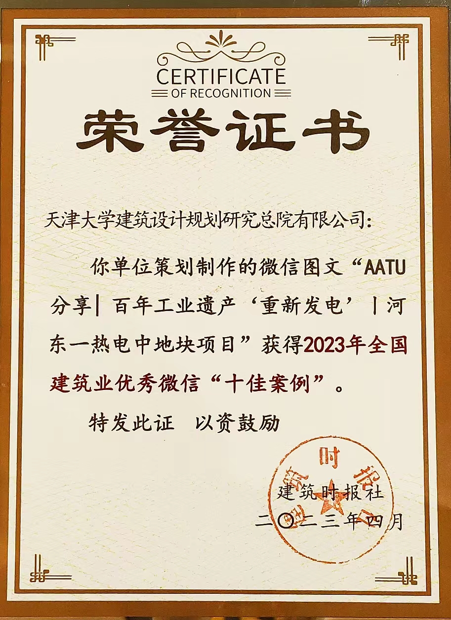 4月20日,由建筑時報主辦的“2023年建筑業(yè)微信公眾號運維經(jīng)驗交流研討會暨全國建筑業(yè)優(yōu)秀公眾號頒獎典禮”于廣西壯族自治區(qū)南寧市舉辦。會上,天津大學建筑設(shè)計規(guī)劃研究總院有限公司(以下簡稱“總院有限公司”)微信公眾號“AATU天大設(shè)計總院”榮獲“最具影響力”公眾號稱號,公眾號推送“AATU分享 | 百年工業(yè)遺產(chǎn)“重新發(fā)電”丨河東一熱電中地塊項目”獲優(yōu)秀微信“十佳案例”獎項。