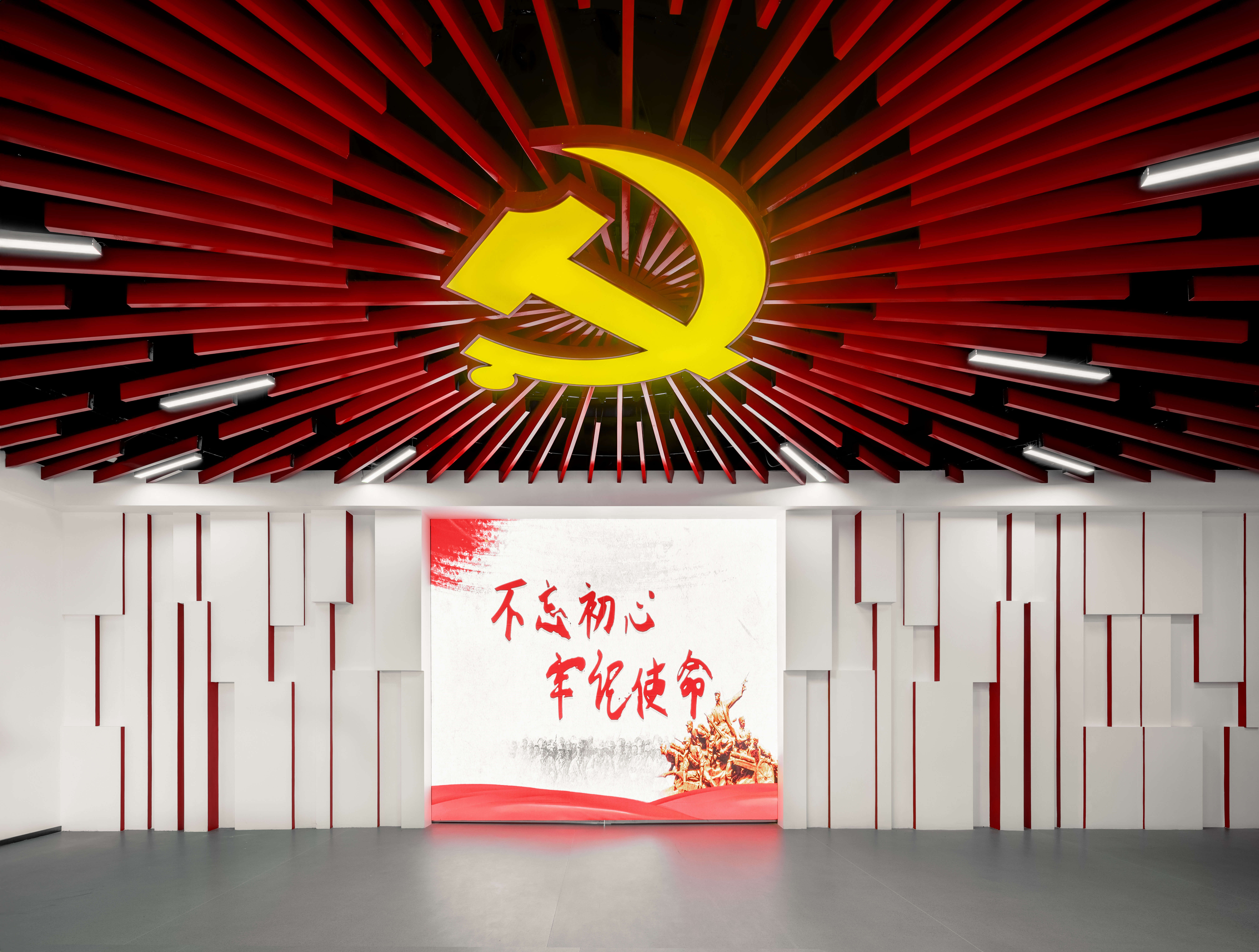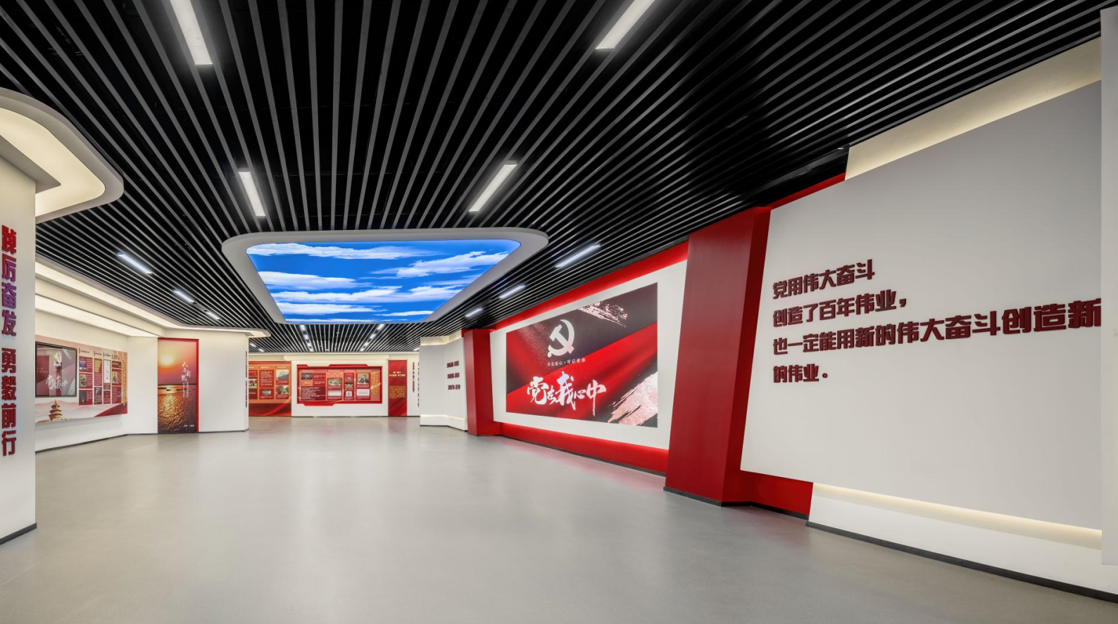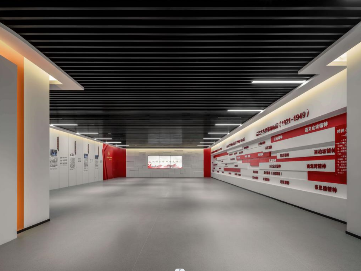 進入第一單元,頂部格柵融合外圍燈帶,與展廳紅白主色調融合,打造莊重、明亮的空間效果。
