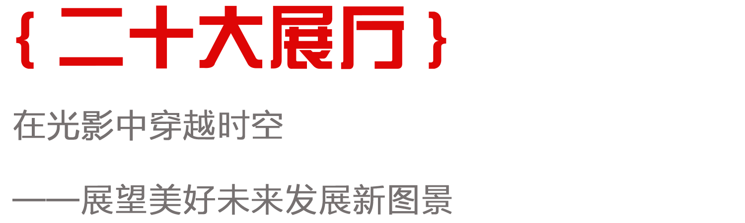 在光影中穿越時空,與革命先輩隔空相遇。重溫建黨百年來走過的鏗鏘足跡,我們進入第二展區——二十大展廳。本展區聚焦中國過去、當下與未來,從經濟建設、法治建設、生態建設、文化建設、社會建設、黨的建設六個方面引領參觀者切身回顧2012-2022十年發展史,聚焦黨的二十大與2023年兩會,展望美好未來發展新圖景。