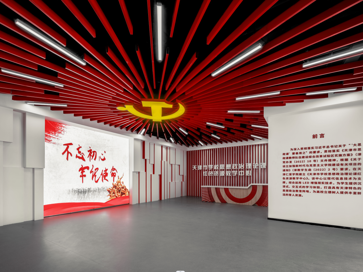 設計團隊在天津市學校思想政治理論課紅色資源教學中心項目的設計中,以“學習黨史”——“聚焦當下”——“傳承精神”為線索,深入挖掘紅色資源,凝練紅色精神、聚焦天津發展趨勢,以生動講述百年大黨的不凡歷程為目標,努力打造全新一體化、沉浸式的天津紅色主題文化教育活動基地。設計流線的排布為希望參觀者站在歷史與時代相輝映的視角,在瀏覽過程中深入學習紅色思政教育,深刻認識新發展階段,深層感受新發展格局,找準時代坐標和奮斗目標,堅定投身強國偉業的遠大志向中,讓紅色基因代代相傳。
