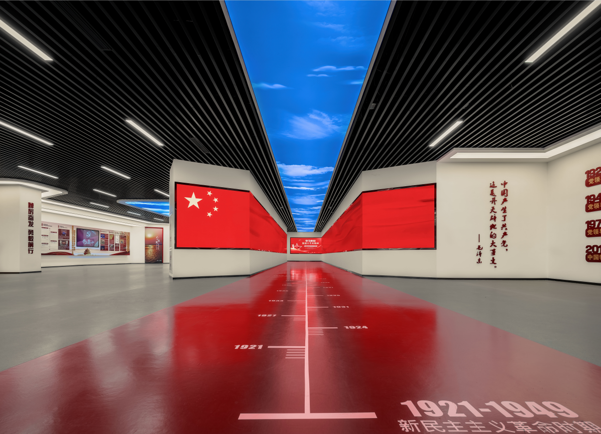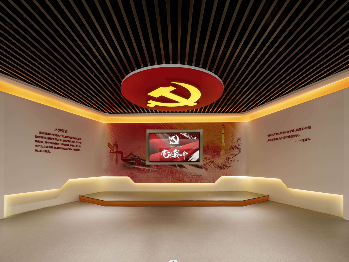 本展區內設入黨誓詞宣誓區域,采用凹形造型設計,以圖文展板、立體字和LED大屏有機結合,融合打造嚴肅靜穆的入黨宣誓區域,重溫入黨誓詞,印證“不忘初心 牢記使命”的黨員本色。右側長征路線圖以電子壁掛沙盤的形式點亮長征點位,伴隨講解,令人心情澎湃。
