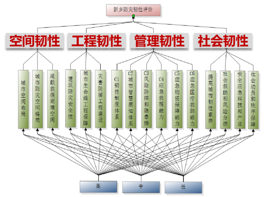 在韌性評(píng)價(jià)系統(tǒng)構(gòu)建方面,對(duì)標(biāo)《國(guó)土空間規(guī)劃城市體檢評(píng)估規(guī)程》和《建設(shè)部2020年城市體檢》,從“空間、工程、管理和社會(huì)”四維度構(gòu)建新鄉(xiāng)市韌性防災(zāi)評(píng)價(jià)體系,推動(dòng)安全系統(tǒng)從傳統(tǒng)工程防御向綜合功能保障的重大轉(zhuǎn)變。