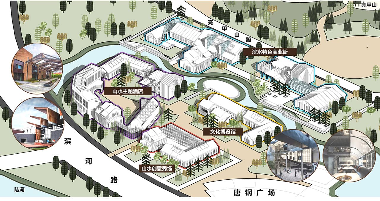陡河是唐山人的母親河,而隱沒在唐鋼院內的亮甲山則是唐山的坐標原點。隨著唐鋼的搬遷,亮甲山重現于世,規劃對亮甲山進行生態修復,圍繞出土動物化石洞穴、出土文物遺址、藥王廟遺址等打造唐山歷史起源公園,做到還山于民。在原唐鋼廣場區域,擴大陡河水面,打造水綠商街游為一體的湖光山色區域,做到還水于民。工業風的建筑中植入新的功能業態,古今對話,工業融入山水,歷史照進現實。