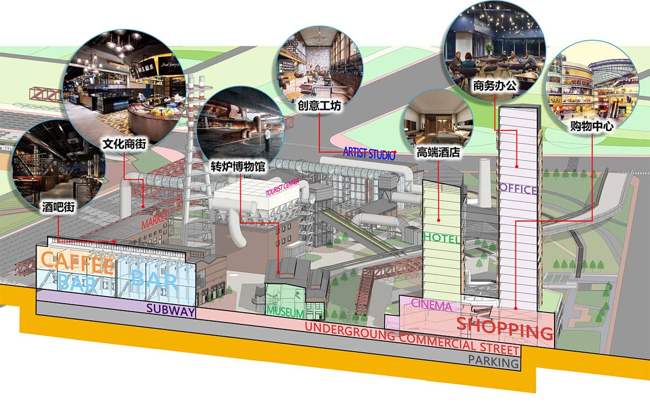 規劃將二煉鋼廠區構筑物、鐵軌、管廊、煙囪等工業歷史記憶點進行保留和建筑景觀提升改造。通過增加現代建筑材質及現代建筑手法,使工業文化與現代功能相結合,將區域打造成二煉鋼科創街區。唐鋼的總部和大腦將留在這里,與鋼鐵生產相關的研發、設計、測試、維修、運維也會留在這里,突顯唐鋼地區本身獨特的工業魅力,綻放唐鋼地塊的新紀元新風彩。