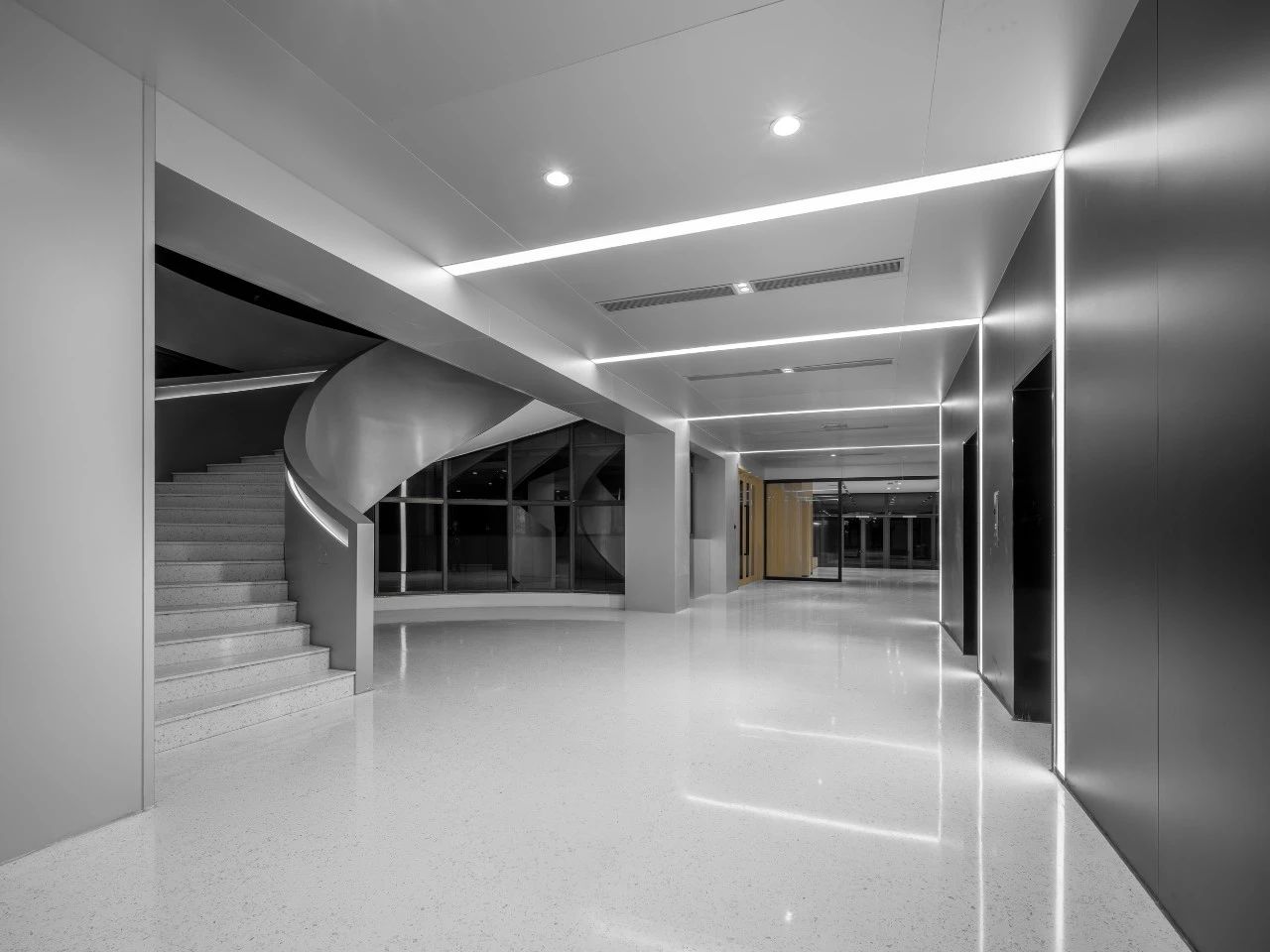 閱覽室部分采用裸頂設計,拆除原隔斷墻體,并引入玻璃墻體,每一個角落都透露出設計者的匠心獨運,柔和的燈光映襯下,舒適的座椅和人性化的服務臺顯得格外溫馨,這些細節的處理無不體現出對讀者的深切關懷和對學習體驗的極致追求。