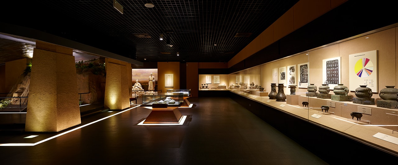 青銅文化:青銅器作為博物院的主題在設計中得到強調。橢圓形的共享廳內外均采用青銅板飾面,在黃土高臺的襯托下如破土而出的青銅器,玻璃材質的頂面向茵湘河方向傾斜,于山水之間熠熠生輝。