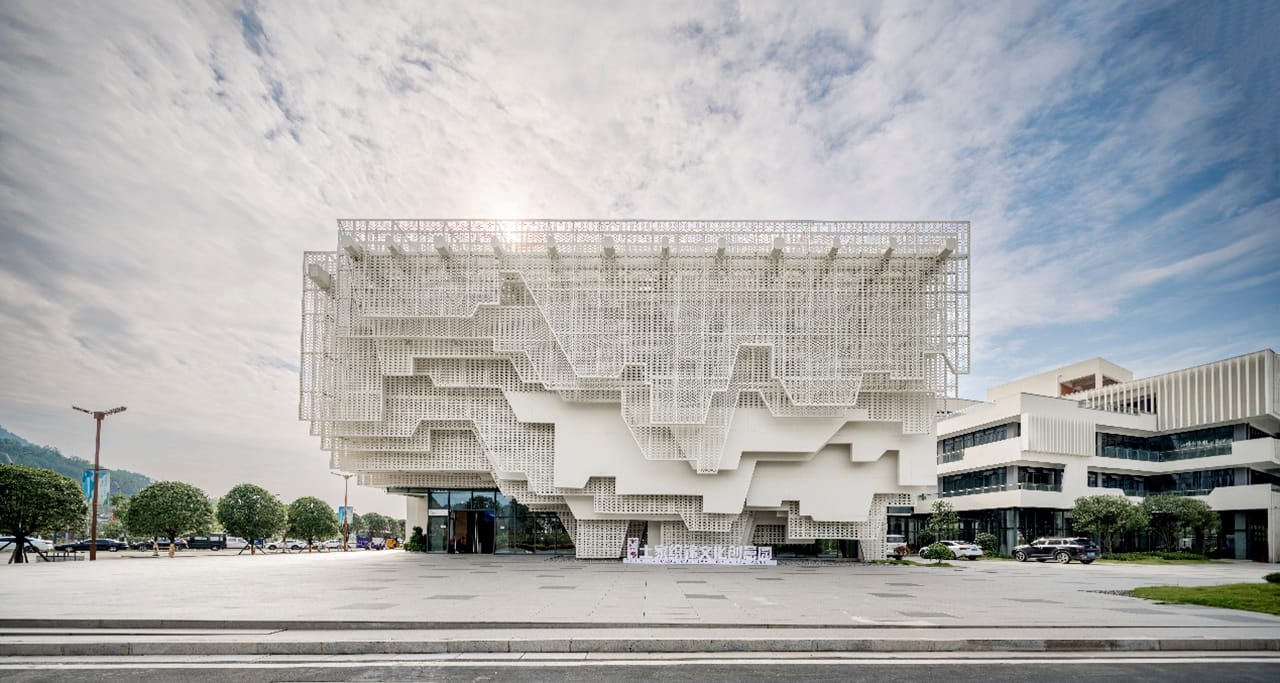 織錦博物館將張家界特有的天然山水和土家織錦相互疊合——層層金屬織錦相互交疊,陰陽虛實之間,交替轉變,最終通過凹凸有致的輪廓與疏密漸變的穿孔,疊合出張家界的山水映像,變化萬千,極大地拓展了想象的空間。