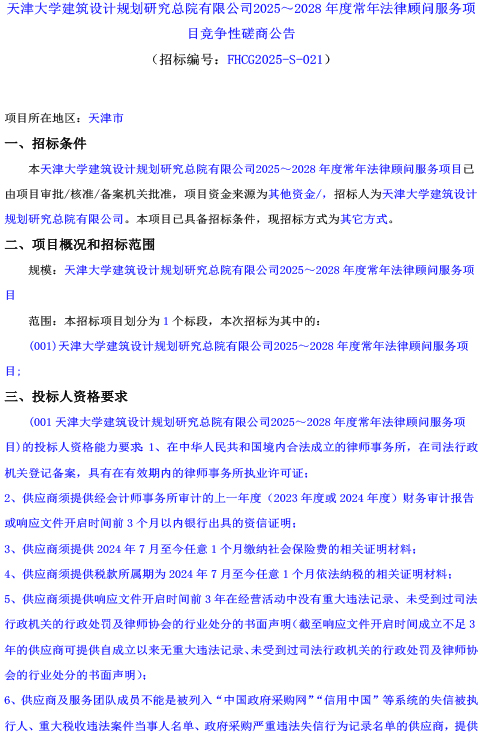 天津大學建筑設計規劃研究總院有限公司?2025~2028年度常年法律顧問服務項目競爭性磋商公告