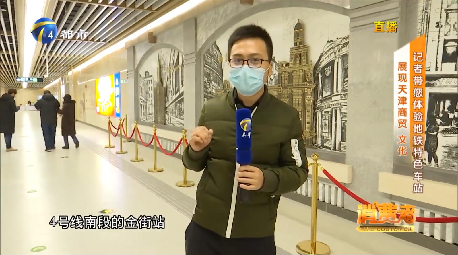 天津地鐵4號線的設計主題定位為“商務發展線”,裝飾裝修以“津貿盛景”為文化主題。以“地上看歷史名城,地下看名城歷史”為總原則,金街站站廳內以灰色和棕色大理石材為主要裝飾材料,墻面以地標性石材雕刻門牌為主要裝修,突出表現天津市的中西合璧的商業歷史文化特色,充分展現天津國際化大都市的發展活力。