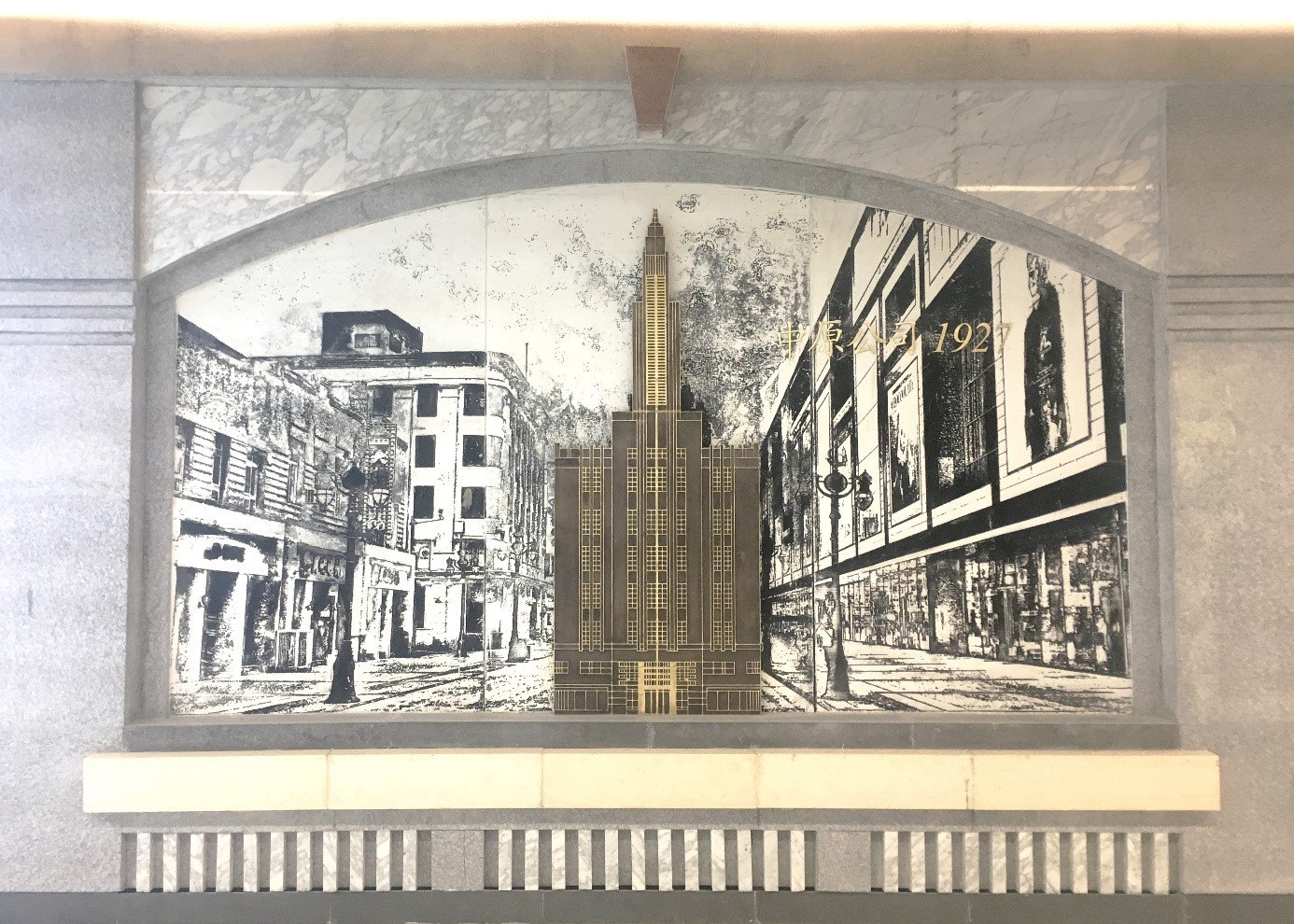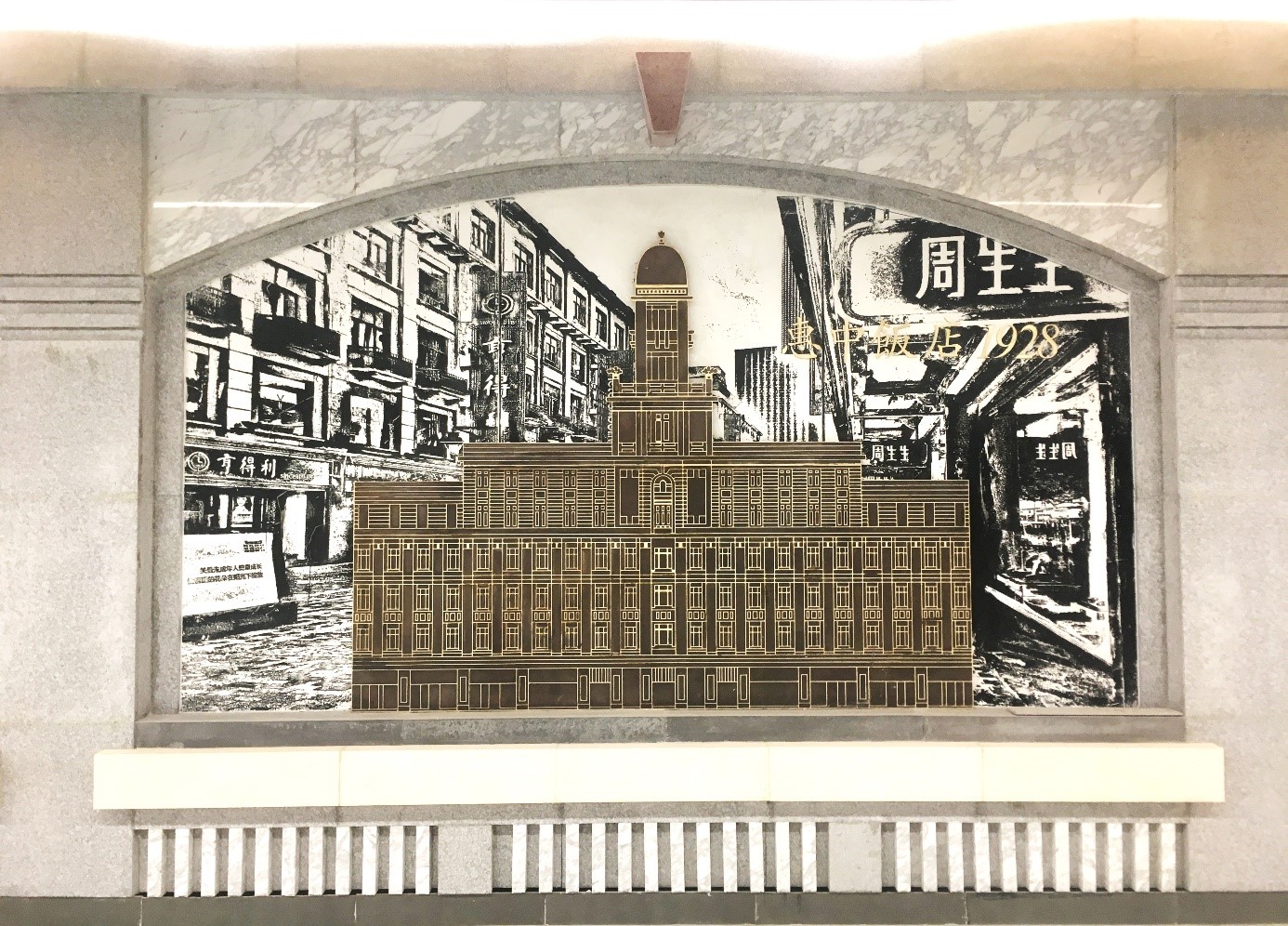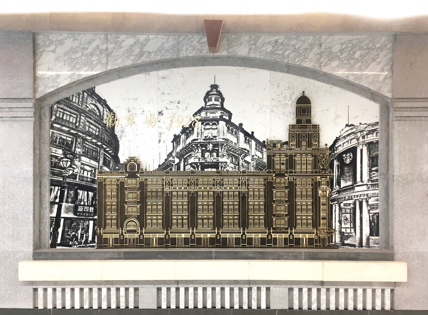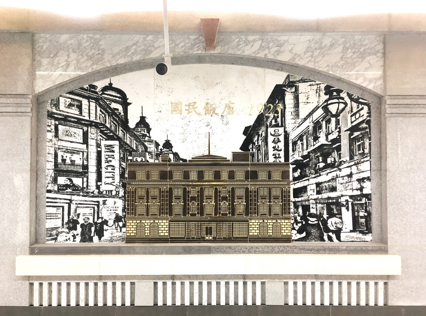 窗框中的背景設計靈感源自于建筑立面渲染圖。利用前景和背景疊加的設計原理,渲染出現代和平路商業街的繁華景象,公共藝術墻整體以建筑作為主語匯,前景選用的是銅雕建筑立面,選取了天津和平路商業街上的6座大體量地標商業建筑,從左到右依次是:中原公司、天津勸業場、交通飯店、惠中飯店、國民飯店和渤海大樓。背景選用的是每一個窗框建筑所在現代和平路商業街街景,二者的疊加形成一幅巨大的地下畫廊,在視覺上給人一種震撼的效果,建筑設計底稿節選自洋樓建筑的原設計藍圖,將其描繪線稿底圖后機雕而成,體現出建筑學的工程技術和設計美學的完美結合。