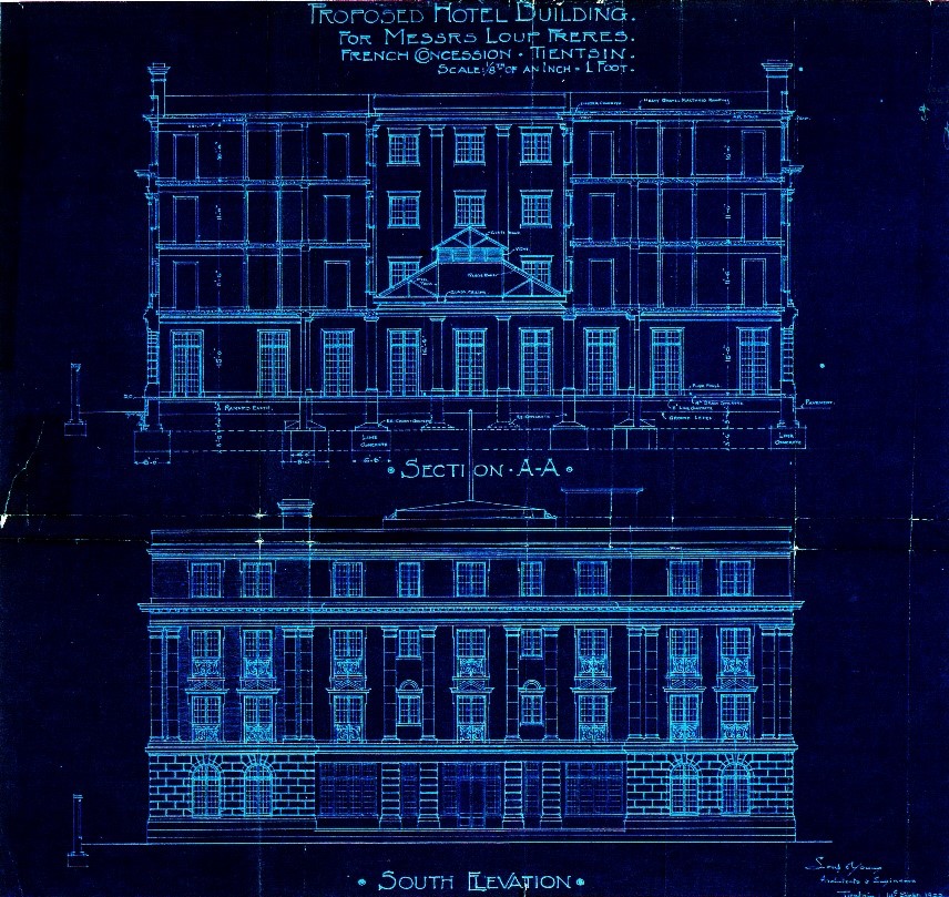 天津國民飯店立面和剖面原設計藍圖(來源:《天津歷史風貌建筑總覽·公共建筑卷一》)