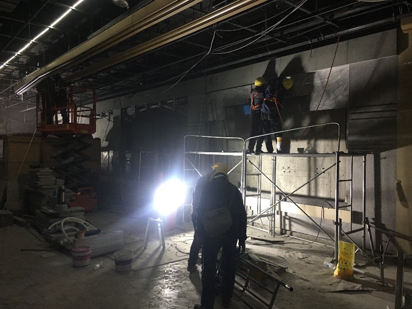 墻體的主體材料以干掛花崗石和大理石為主要幕墻材料,背景選用的是白色烤瓷干掛蝕刻鋁板幕墻,石材幕墻與金屬幕墻的完美搭配,是建筑立面在地下商業空間的應用,同時也是將建筑材料原汁原味地展現出來的一次嘗試。