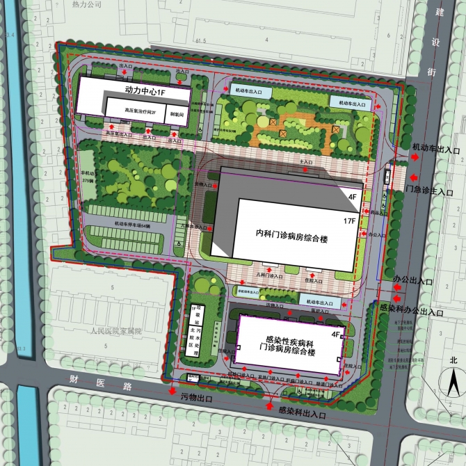北院區(qū)用地面積約3萬平米,總建筑面積8.9萬平米,總床位數(shù)400床。總體規(guī)劃將感染樓設(shè)于用地東南側(cè),獨(dú)立一區(qū),疫情時(shí)可封閉管理。北院區(qū)分為兩期建設(shè),一期于用地東側(cè)設(shè)內(nèi)科門診住院綜合樓,于西北角設(shè)高壓氧艙及動力中心,西南側(cè)設(shè)污水處理站及垃圾站;遠(yuǎn)期于西側(cè)建設(shè)康復(fù)腫瘤綜合樓。