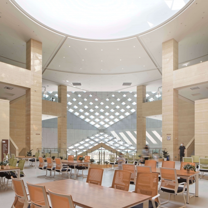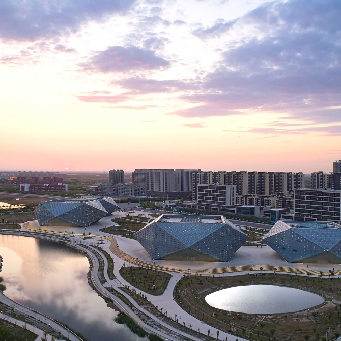 場地規劃布局延續上位規劃的對稱格局,建筑以中軸線為核心呈扇形展開,東側布置圖書館和科技館,西側布置文化藝術館、檔案館和青少年活動中心。在東、西、南、北四個方向分別設置開放空間,呈現不同的主題:北面設置較為開闊的群眾活動廣場,便于容納群眾性集體活動;南面沿湖面設置形態自由、綠化豐富的生態廣場,作為主要的市民休閑觀景場所;場地西側設置以抽象藝術景觀為主的藝術廣場與文化藝術館和檔案館、青少年活動中心相對應;東側設置以理性景觀為主的科技廣場與科技館和圖書館配套。