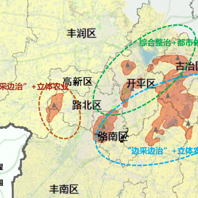以生態(tài)產(chǎn)品價值實現(xiàn)導向,顯性修復與隱性修復相統(tǒng)一,建立“格局引領(lǐng)-過程耦合-分區(qū)集成”的系統(tǒng)化修復路徑。錨固生態(tài)安全格局、劃分生態(tài)修復二級分區(qū),識別7類重點修復區(qū)域,其中采煤塌陷區(qū)著重探索“生態(tài)+”治理、利用型修復模式。