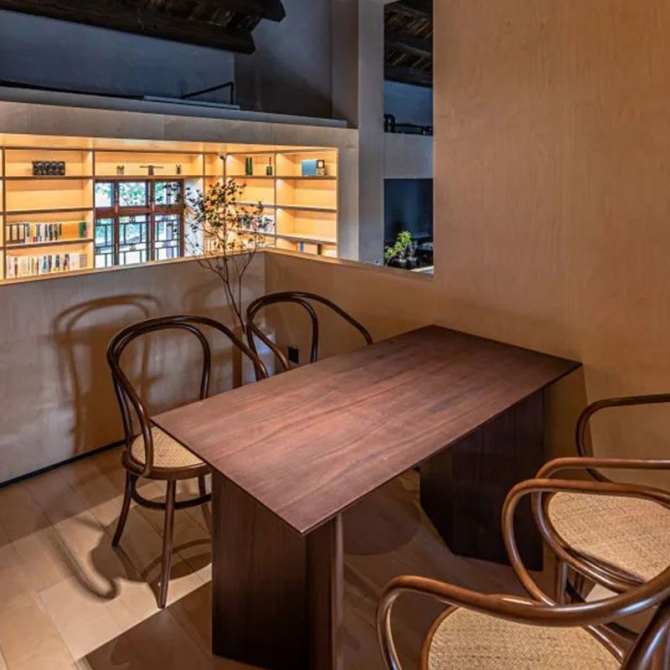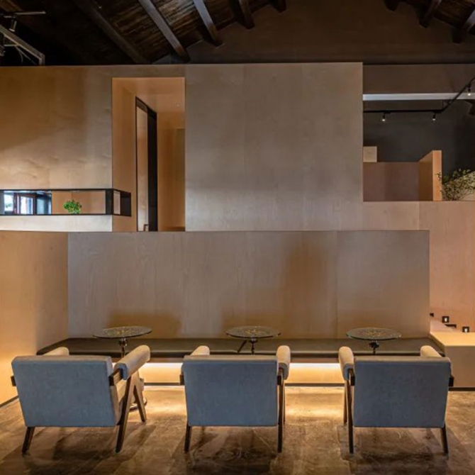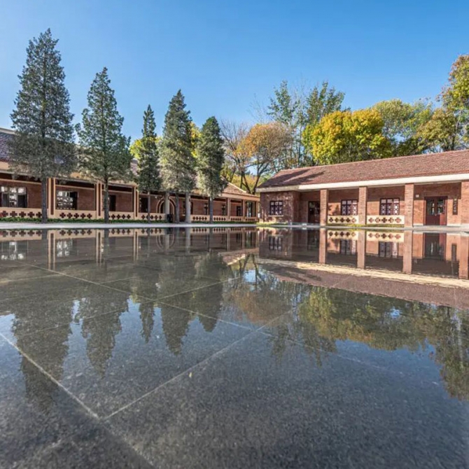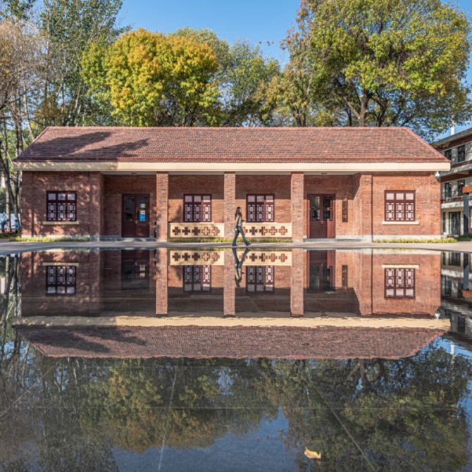 蘇聯(lián)專家樓會(huì)議室作為一機(jī)床廠史館,內(nèi)部以一機(jī)床廠整體工業(yè)化發(fā)展變革為核心,展示原有的工藝生產(chǎn)過程,體現(xiàn)一機(jī)床廠的輝煌歷史。景觀在設(shè)計(jì)中考慮在不影響建筑風(fēng)格同時(shí),在中心位置設(shè)計(jì)一方靜水,形成四水歸堂、水聚天心別具的景觀風(fēng)格。水面中映襯的建筑倒影,使得整個(gè)場(chǎng)地更加靈動(dòng)。