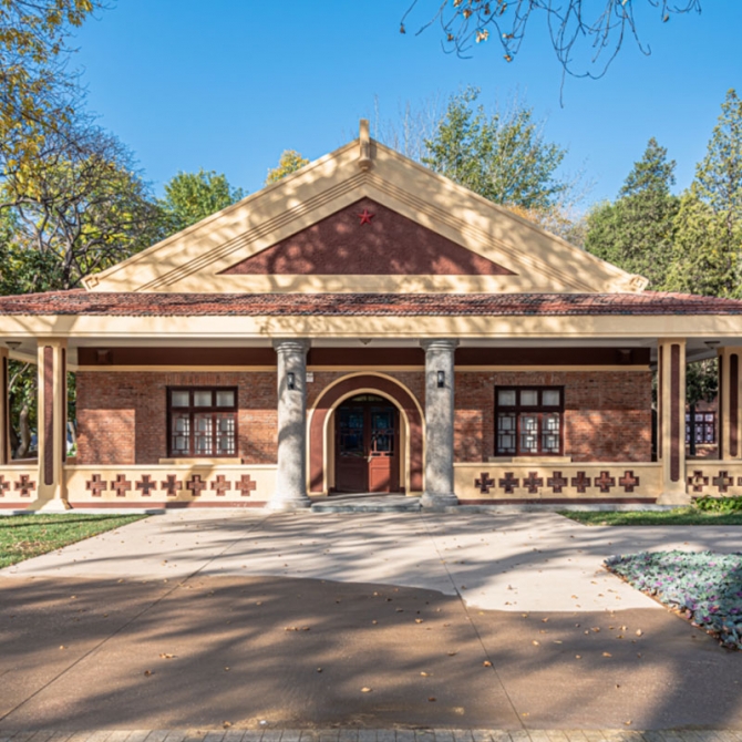 蘇聯(lián)專家樓和會(huì)議室位于天津第一機(jī)床總廠入口和前區(qū)的重要位置,設(shè)計(jì)于1957年10月,1958-1963年建成。初始名為療養(yǎng)所與療養(yǎng)食堂,后更名為蘇聯(lián)專家樓及會(huì)議室。建筑采用傳統(tǒng)歇山頂和懸山頂形制,內(nèi)部為木桁架結(jié)構(gòu),掛紅色水泥瓦。該建筑采用中西合璧的建筑手法,簡(jiǎn)化了柱式和裝飾,實(shí)現(xiàn)了傳統(tǒng)與現(xiàn)代的融合,是研究當(dāng)時(shí)建筑設(shè)計(jì)風(fēng)格的重要例證,是天津同時(shí)期建設(shè)的少數(shù)建筑實(shí)物。