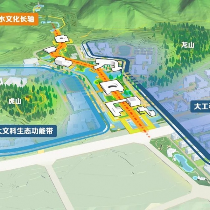 山水文化長軸兩側依托西校區和北校區,動態拓展,圍繞龍山、虎山形成兩條兼具靈活性、融合性,符合中國未來大學發展趨勢的大文科、大工科生態功能帶。