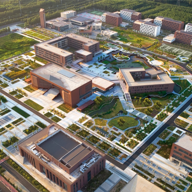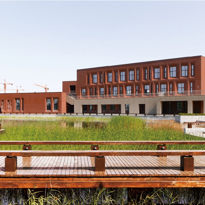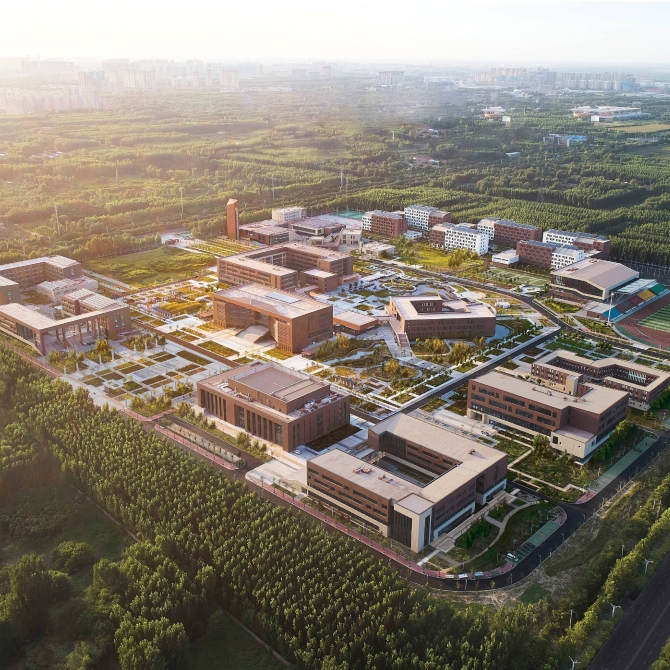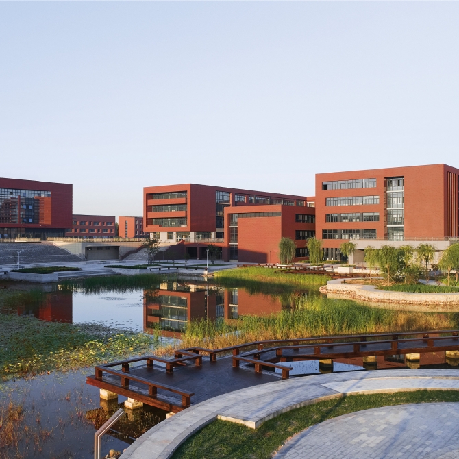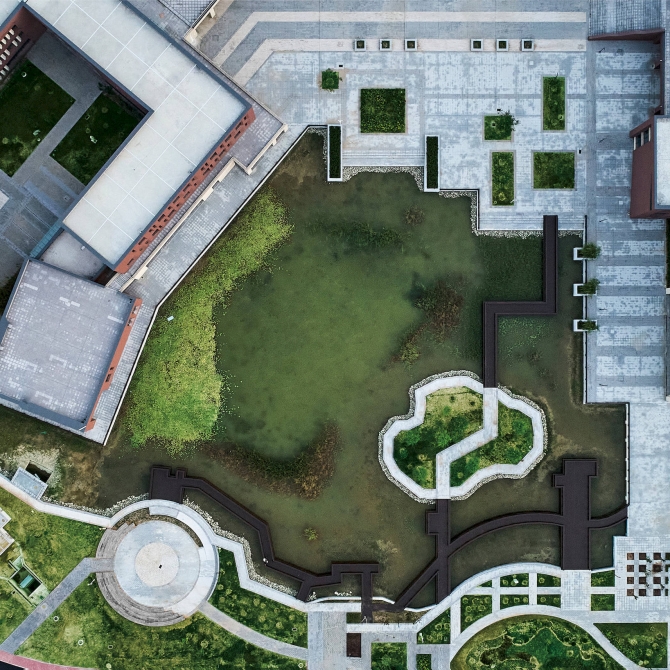 德州高級師范學校新校園位于德州市郊郁郁蔥蔥的田園濕地環境中,設計盡可能傳承原有的田園生態地文基底,結合校園教學生活功能的實際需求,實現生態本底的有效保留和轉譯,將濕地景觀與校園環境相融合形成一個豐富多樣、自然野趣、綠色智慧的生態校園。