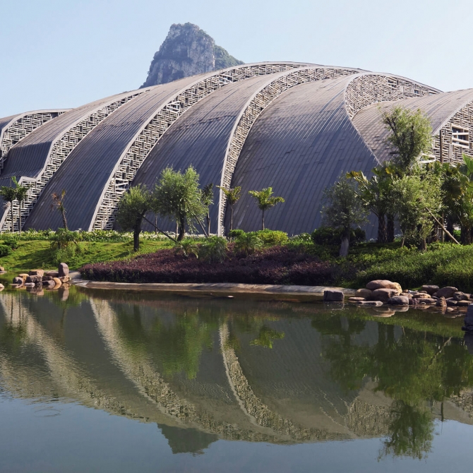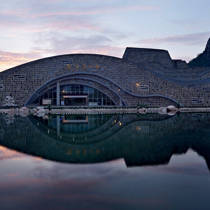 奇石館的空間形體通過拓撲變換和分形幾何的無規(guī)自相似與自仿射的變化,曲-水的典型特征,折-山的典型特征在一個形體的不斷變化中和諧統(tǒng)一在一起,具有豐富驚奇的視覺效果。柳州奇石館與自然環(huán)境渾然天成,銳意推陳出新,傳承中國源遠流長的山水文化。