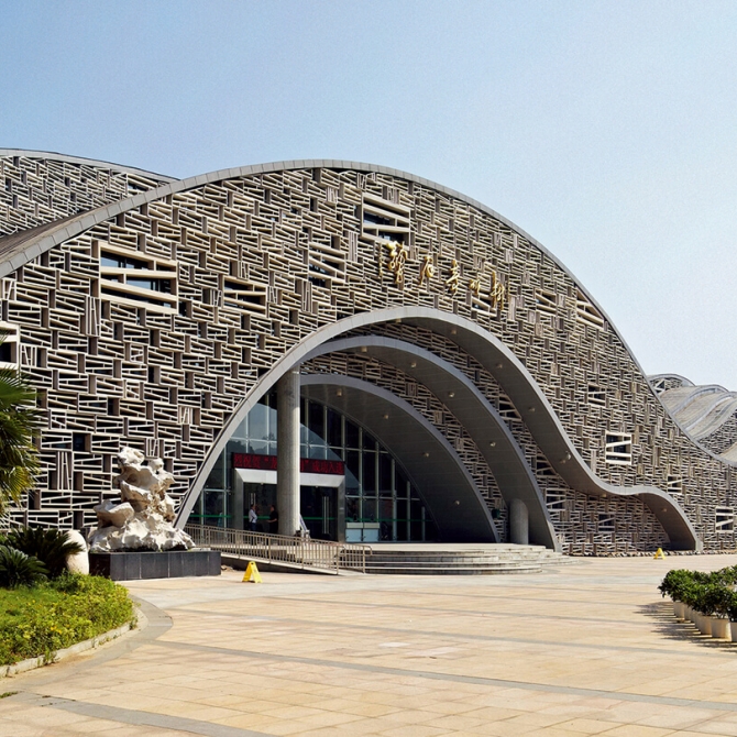 奇石館形體猶如奇峰或奇石變化,立面之上的柵格則脫胎于大地、山體以及巖石表面的紋路和肌理,為整個展覽館增添了獨特的石之韻味。在立面設計中運用計算機參數(shù)化方式,將柵格由四種模數(shù)制式的單元所構成,單元全部由同一圖案生成。