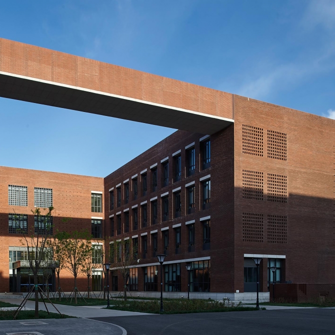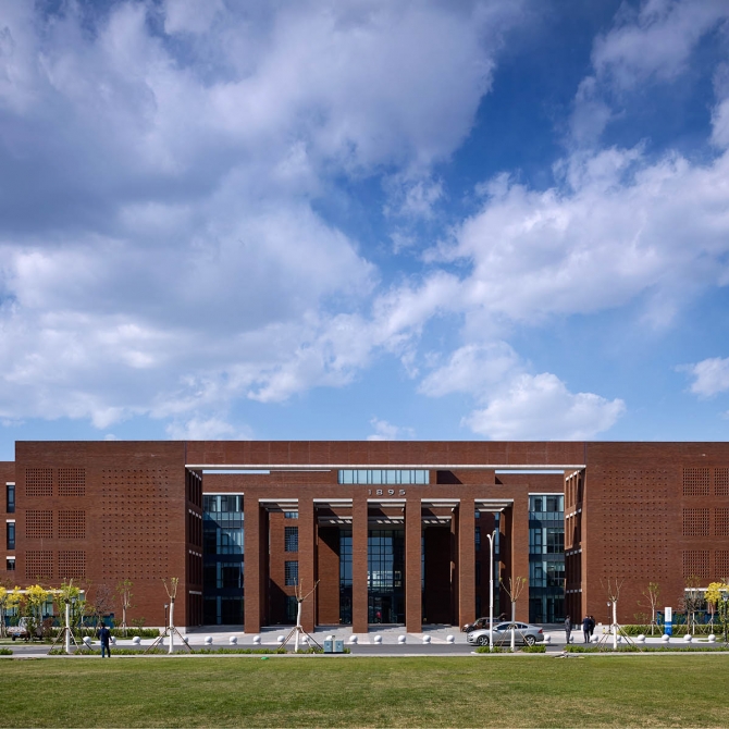 設計沿襲了老校區深厚歷史背景下工科校園嚴謹厚重的特征,建筑用色用材厚重,外飾面選用頁巖燒結清水磚墻,采用內外葉墻組合砌筑的方式,特殊的構造極大地增加了設計和施工難度,對施工精度提出了更高的要求。最終經過各方的共同努力,呈現的作品體現了較高的完成度,達到了設計的預期效果。