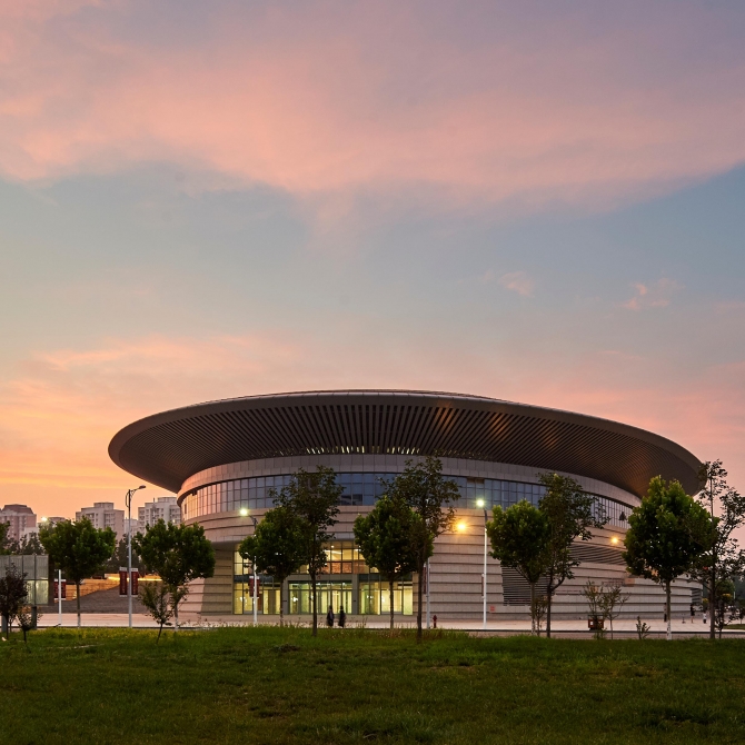建筑造型以橢圓形的形態為出發點,和原有風雨操場的形態保持一致,也呼應了建筑南側的國際交流中心的總體形象。建筑三面平臺的造型,既滿足了觀眾的疏散要求,又是新老建筑連接的手段。建筑外立面采用干掛石材裝飾幕墻,使體育館在完成形象表達的同時又控制了整體造價,材料的自潔功能又使建筑歷久彌新。建筑橢圓形的金屬屋頂向四周懸挑,設金屬百葉吊頂,從而獲得建筑、結構、設備各專業的和諧統一,既展示了建筑的結構之美,也增強了建筑的動感和活力。
