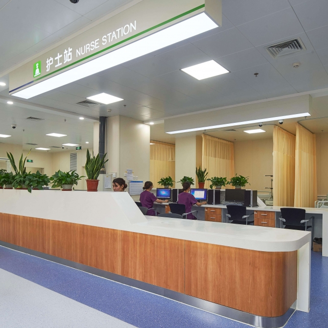 門診大廳:是醫院直接對外開放的區域和窗口,其設計特點應表現明快、順暢、簡潔、大方的特色,在設計中選擇淡雅柔和的米色、乳白色等為主調,材料使用以經久耐用的人造石英石地面、石材和抗貝特板墻面以及金屬板吊頂等為主。同時,作為醫院和城市的窗口,在適當的位置引入反應地域文化特征和醫院特點的裝飾設計手法,為醫院的公共空間注入鮮明的個性也是設計所突出的重點之一。