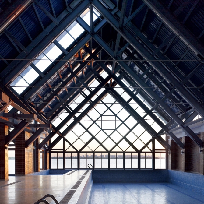 西翼游泳館直落湖中,落地大窗可把東麗湖的落日余暉納入館內(nèi),泳池成了湖面空間的延續(xù)。建筑風(fēng)格與住宅的英式TUDOR風(fēng)格相協(xié)調(diào),主體采用紅磚,搭配壓頂和過(guò)梁組成的暖黃色的橫線條,局部飾以米色石材門廊,典雅、穩(wěn)重、細(xì)部豐富考究。