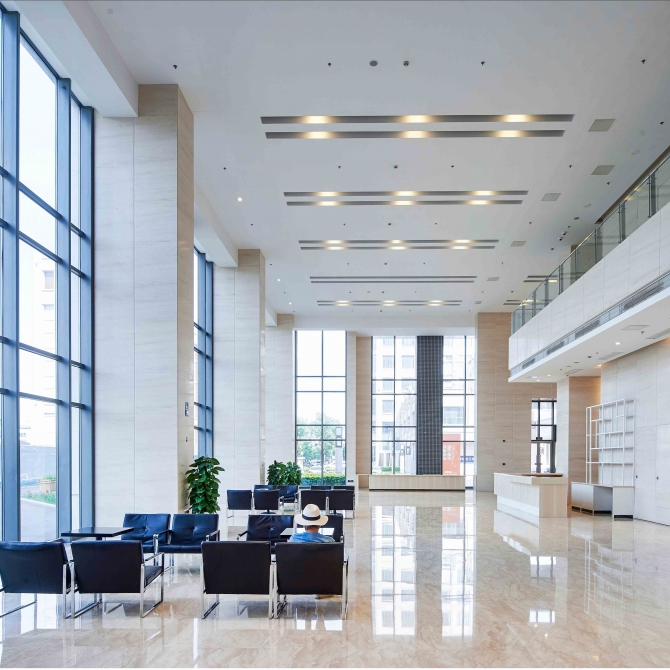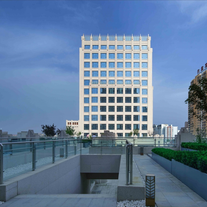 一改以往辦公和商業建筑為追求商業利益過渡擠壓城市公共空間的設計理念,將部分商業建筑盡量后退。建筑造型遵循“大道至簡”的設計原則,以豎向線條為主,立面材料采用石材,整體建筑風格為Artdeco風格,造型中正統一,大氣簡潔。