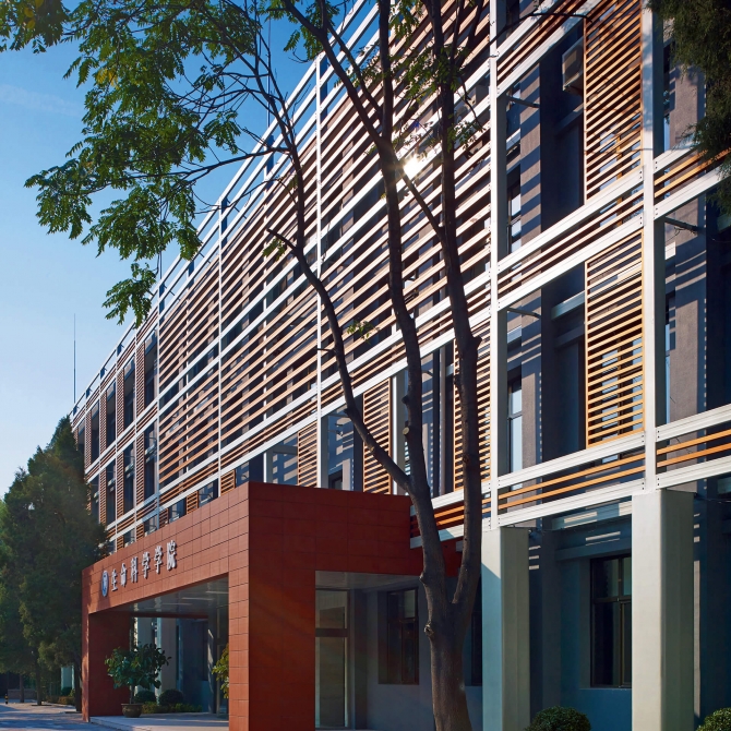 天津大學15教學樓(生命科學學院)占地面積1345平方米,建筑面積5380平方米。改造前為4層普通教學樓,建于20世紀70年代末期,磚混結構,平面形式為內走廊、兩側布置房間。經過多年使用,建筑外墻出現破損,整體能耗水耗高、舒適性差,難以滿足使用要求。2012年11月至2013年10月,依托國家科技支撐計劃“既有建筑綠色化改造關鍵技術研究與示范”,作為示范工程對15教學樓進行了全面系統的綠色化改造,改造后作為天津大學新成立的生命科學學院綜合辦公場所。改造工程將被動式改造策略與主動技術融合在一起,創造出嶄新的建筑形象,目前已經通過綠色建筑二星級評價。