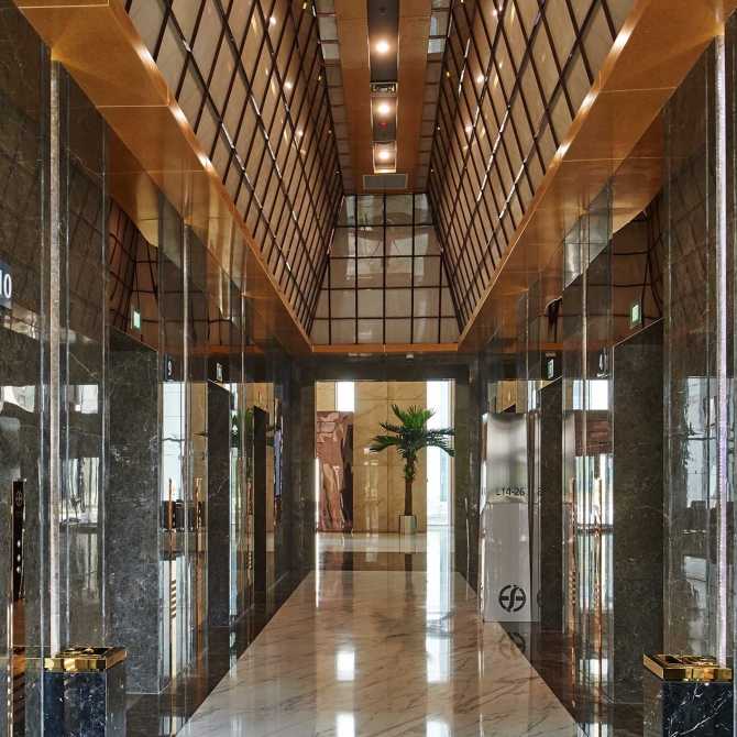 方案中對于建筑材料的選擇同樣遵循響螺灣商務區規劃導則,采用暖色調材料,所有外墻面都選用鋁塑板,低層商業店面采用大面積落地夾膠玻璃,便于櫥窗展示,辦公、公寓部分等玻璃部分全都是用Low-E玻璃和高效能環保型金屬窗框,由于窗墻比接近50%,因此可以有效地減少因玻璃幕墻帶來的節能問題,大大節省了運營費用,同時有效地避免了光污染,努力營造一個室內外環境和諧的節能環保型綠色生態建筑。