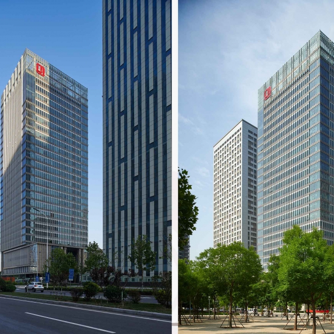 用于基地呈不規則形狀,為保證建筑退線與周邊道路相互平行,建筑主要平面呈平行四邊形,設計在經濟合理的原則上,盡可能地增加有效使用面積。建筑外觀以淺灰色鋁板與玻璃為主要建筑材料,錯落有致的構件排布反映了自然山水的天然紋理,使沿河的建筑形象更加生動活潑。本項目建成后已經成為響螺灣商務區重要的標志性建筑。