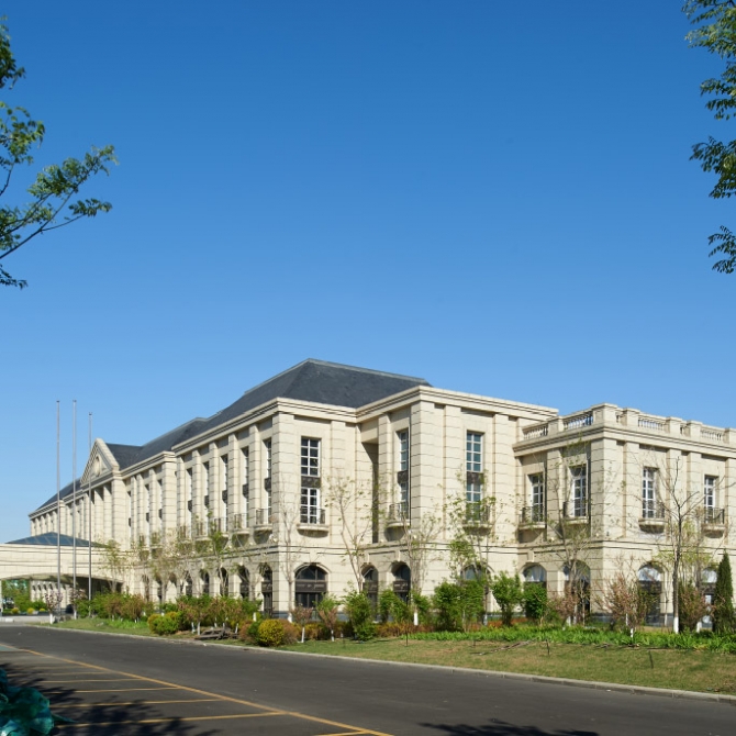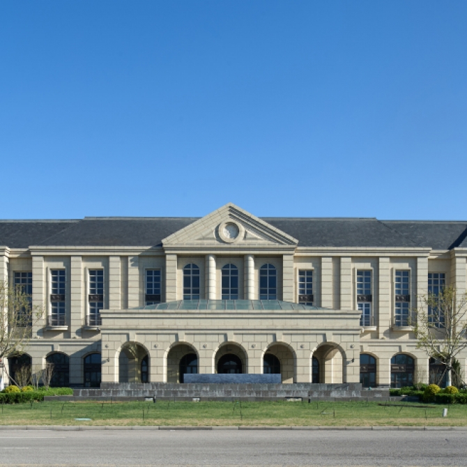 附屬用房呼應(yīng)天津的文脈特征,結(jié)合紅酒莊園建筑的特色,采用傳統(tǒng)歐式建筑語言,首層采用拱券和券心石的開窗元素,二層開窗使用窗套和帶有花紋的鋁板裝飾,頂部為坡屋頂和局部平屋頂相結(jié)合的建筑形式。外裝修材料采用米黃色石材搭配古銅色鋁板,屋頂采用板石瓦屋面。