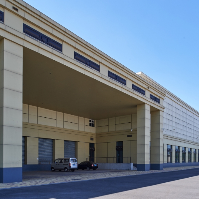 紅酒倉庫外立面設(shè)計(jì)保留了古典建筑的比例,將古典的建筑語言抽象化,形成更為簡潔、現(xiàn)代的建筑立面元素;外裝修材料采用米黃色、褐色纖維水泥板,結(jié)合金屬裝飾帶,使建筑整體體現(xiàn)出帶有古典比例的現(xiàn)代化物流站的建筑形象。