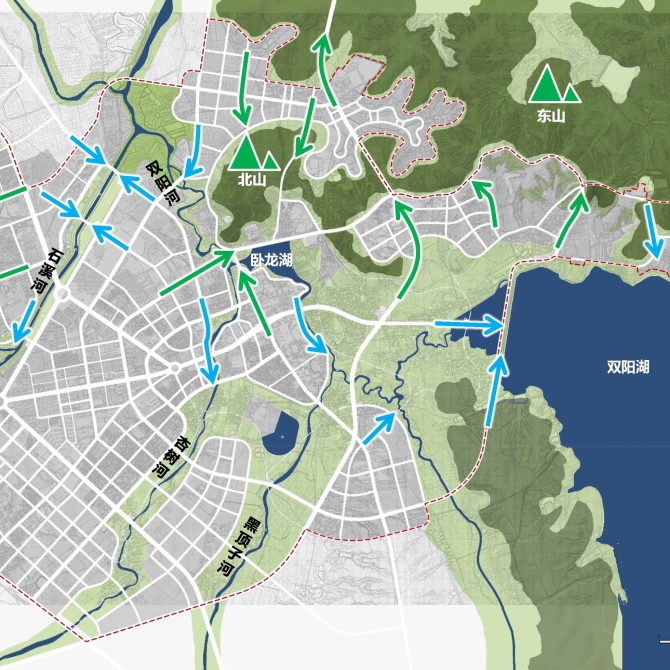 通過城市斷面分析,提出打造“通山抵水”的“街巷空間”,以大區(qū)域尺度下的城市設(shè)計視線、通廊分析為依托,以圓通寺、雙陽水庫大壩等公共開敞空間為核心,制定中心城區(qū)開發(fā)強度的三級管控系統(tǒng),最終實現(xiàn):城市級片區(qū)開發(fā)強度管控,引導(dǎo)城市良性可持續(xù)發(fā)展。