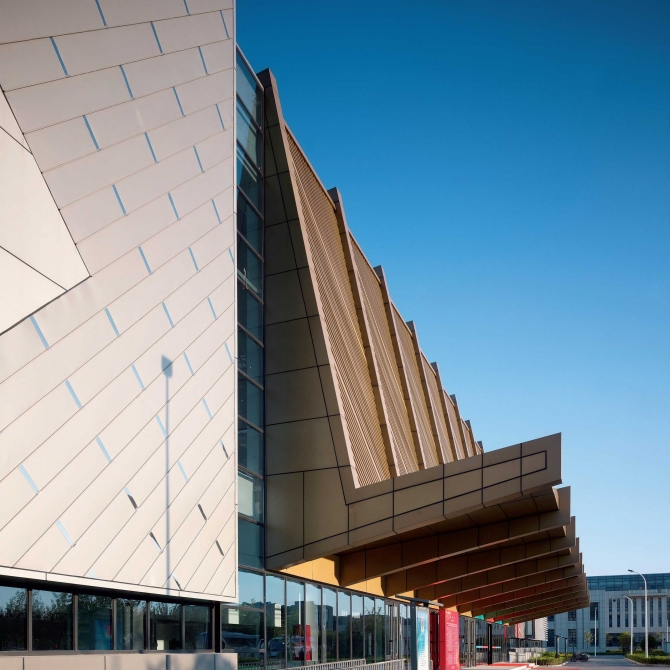 天津工業(yè)大學(xué)前身是紡織學(xué)院。本場館在建筑外表皮的設(shè)計中運用多種線條編織手法,再現(xiàn)紡織理念。鋁合金板材的各種選型精心搭配,形成了多樣化的機理模式。建筑西側(cè)的主入口空間采用金色鋁方通折板結(jié)構(gòu),巨大的挑檐突顯了宏偉的氣勢。建筑金色與金屬色的合理運用與周邊體育館的色調(diào)相匹配,強調(diào)了體育中心的整體感。西側(cè)主墻面上點綴很多不銹鋼拋光格片,在天光的照射下熠熠生輝,給場館建筑增添許多靈動之感。南北西側(cè)玻璃幕墻與金屬楔形結(jié)構(gòu)互相穿插構(gòu)成了側(cè)面入口的趣味空間,豐富的表情加強了本場館與周邊環(huán)境的對話關(guān)系。
