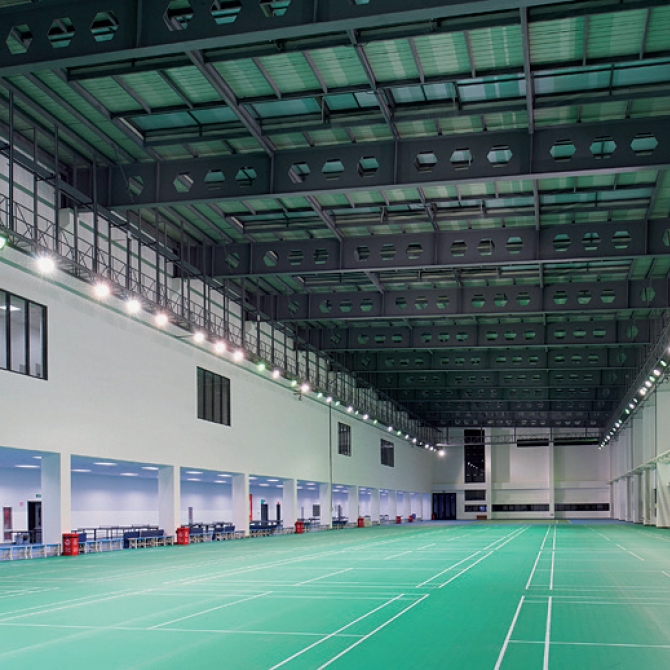 場館室內(nèi)擁有各類球場及各種健身館,室外則擁有主席臺和觀眾席位,使風(fēng)雨操場與運動場的功能完美結(jié)合。室內(nèi)首層大空間部分設(shè)置需較高層高的網(wǎng)羽場地,局部二層下面設(shè)置乒乓球運動區(qū)。平面布局緊湊,利用率極高。二層采用單側(cè)走廊的交通模式,多個健身館并聯(lián)式布局,方正的場館空間便于開展各種類型的健身活動。