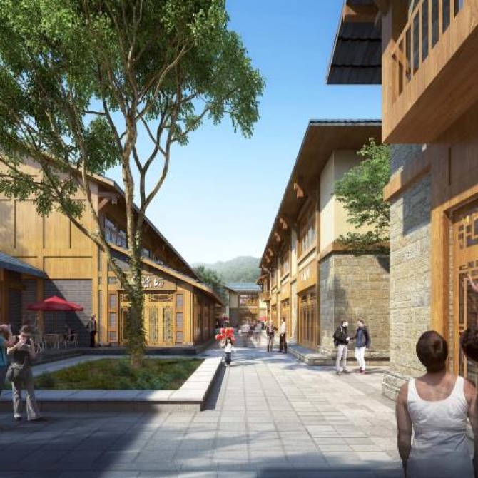 “一軸”為古驛道歷史文化體驗軸,是連接新老古鎮眾多文化旅游景點的步行交通要道,也是形成本項目功能布局的主干,承載了交通、文化體驗、視線引導等多種功能,將本項目各功能分區和景點串聯成一個整體;