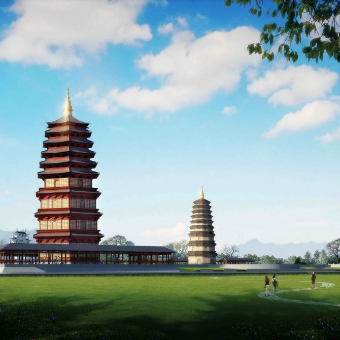 南廣場平面圓形,圓心立含藏赤蓮雕塑,外圍環繞12座石燈。核心廣場整體呈45°放置的正方形,以廣場中軸線與下穿道路中心線的交點為圓心,以150米為直徑畫圓,核心廣場外邊外切與圓,雙塔平面中心位于圓與水平軸線的交點上,雙塔概念依據五行,東方屬木,將東塔定為木塔,西方屬金,土生金,將西塔定為磚石塔,另結合開山寺西側的12顆榕樹與東側的6顆榕樹,分別確定西塔的十二邊形與東塔的六邊形,雙塔皆采用下三層結合上六層的結構層次。北廣場以圓形水池和雕塑噴泉為中心,雕塑噴泉——寶珠凈蓮,東西兩側有碑廊。